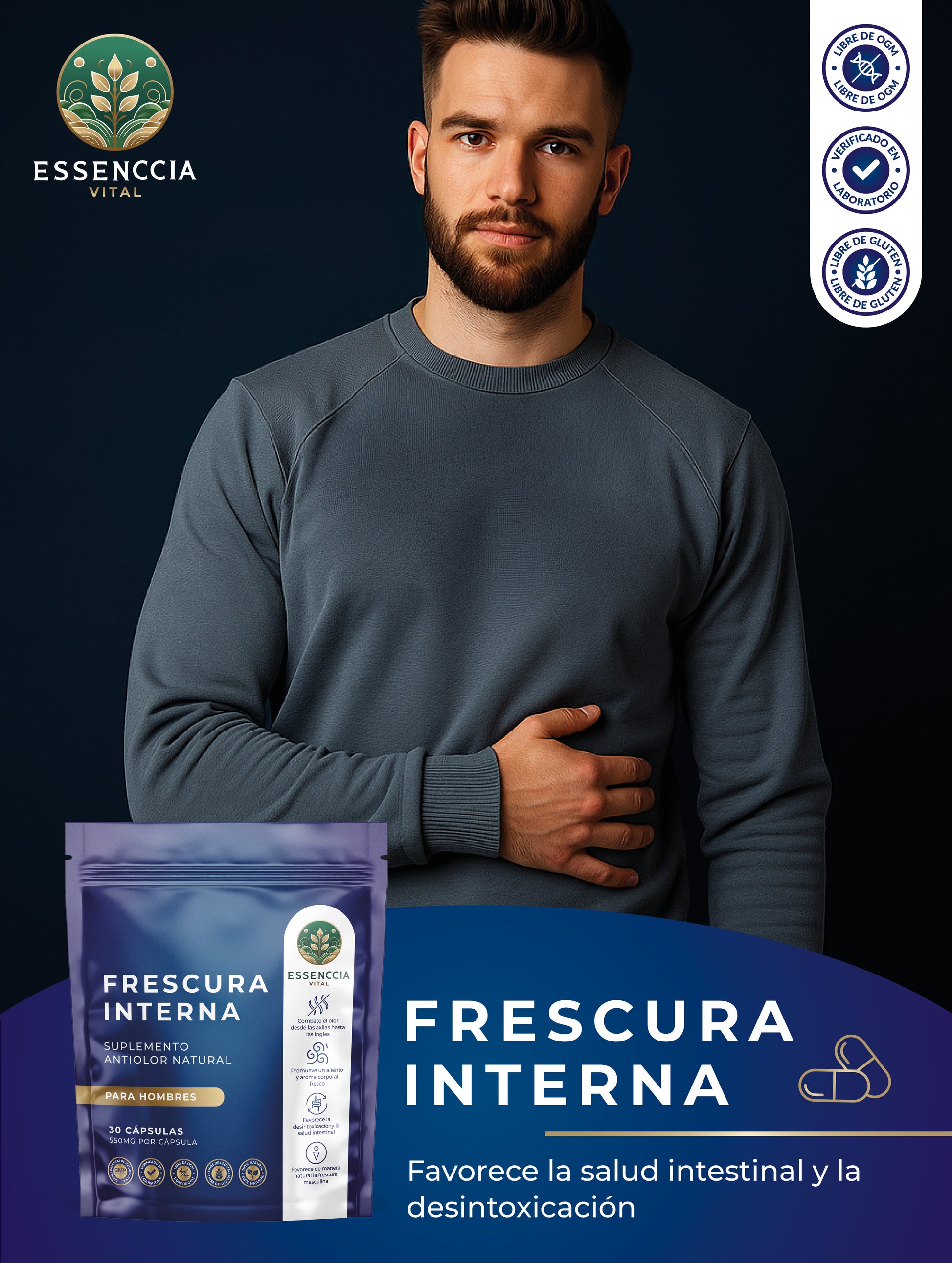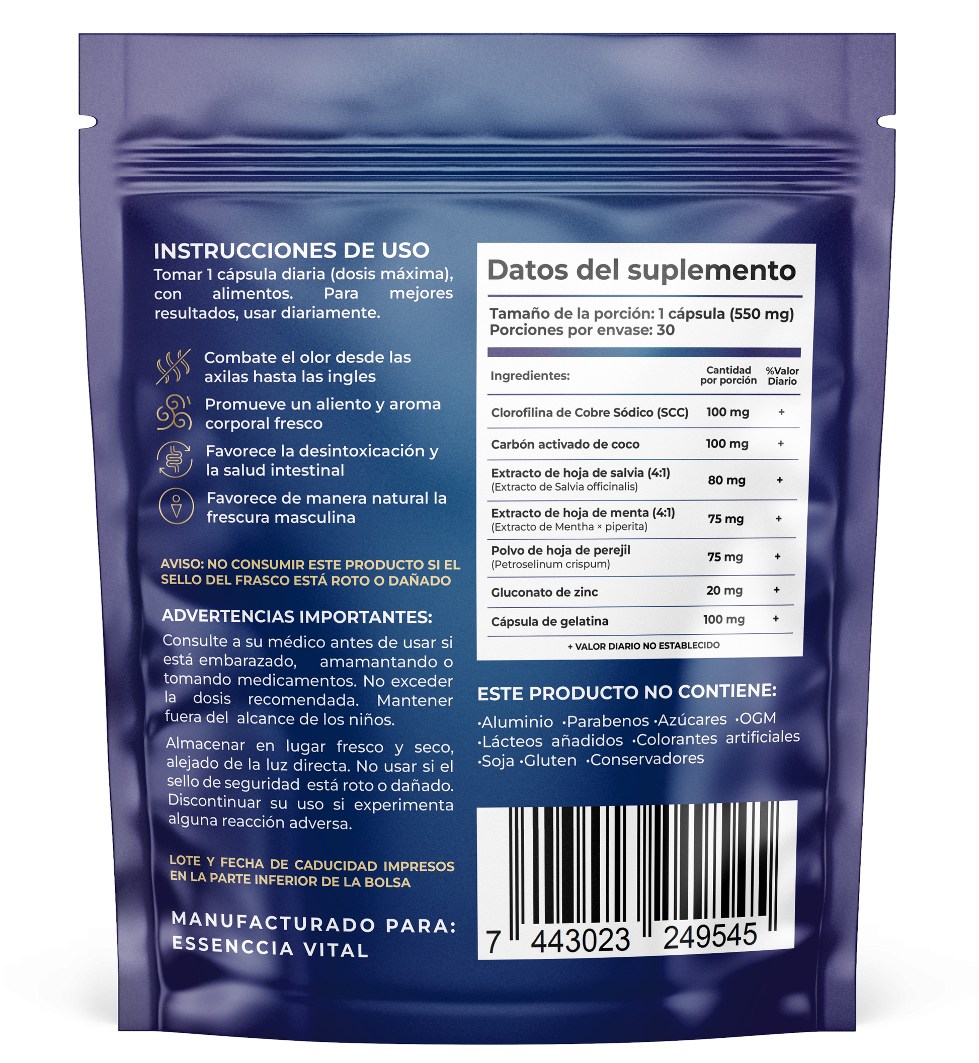 Essenccia Vital Hombre es tu nueva arma secreta para mantenerte fresco todo el día, sin químicos agresivos ni fragancias artificiales. Esta fórmula avanzada actúa desde el interior, neutralizando olores corporales, sudor y mal aliento gracias a una mezcla de ingredientes naturales como clorofila, carbón activado, menta y zinc.